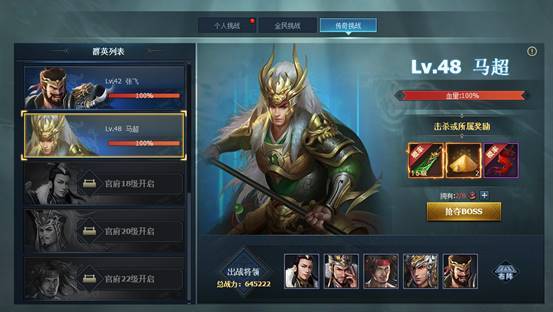 2.【个人挑战】中有多个不同等级的三国武将等待着玩家的挑战,挑战失败无任何损失,挑战成功后可以获得主公装备、强化石等奖励。每个将领第一次被挑战成功还会有额外的首通奖励。