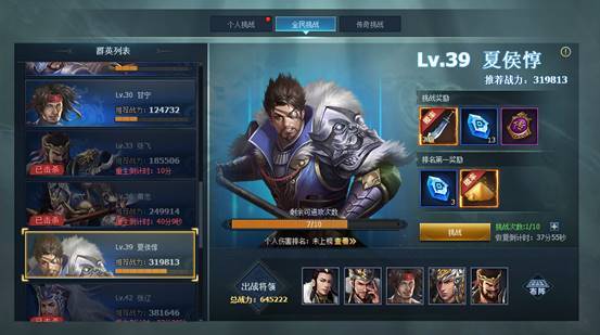 3.【全民挑战】玩法中,有多个等级的将领可供所有玩家一起挑战,每个将领被挑战10次后即被击败,一段时间后将重生,再次迎接玩家的挑战。
