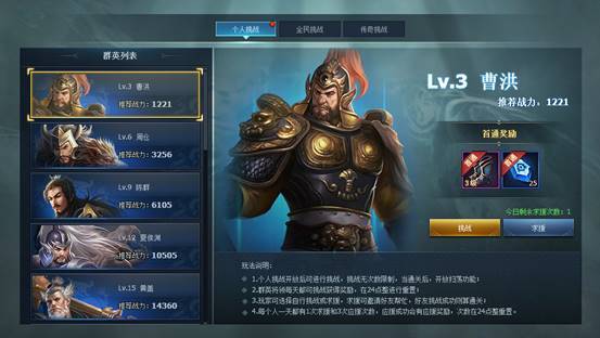 1.在百战群英中有三个玩法【个人挑战】【全民挑战】【传奇挑战】,每个玩法都可以获得丰厚奖励。
