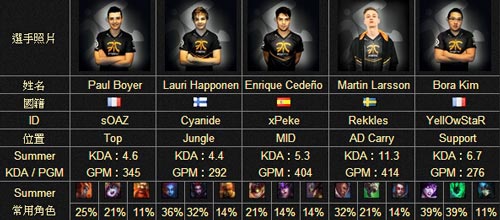 2014 赛季中 Fnatic 走来有些颠簸,春季赛中经历了连胜与连败的三温暖,在夏季中也是靠着最后五周的 12 胜 2 败拉尾盘,才站稳例行赛第二的位子。虽然在决赛中败阵给 Alliance,但 Rekkles 对于克格莫与崔丝塔娜在会战中的掌握让人难以忘记,而 sOAZ 与 Cyanide 前期的 2v2 配合让Fnatic在注重AD发育的主轴下不失前期主动,加上 YellOwStaR 一流的跑线支援, Fnatic 的粉丝可是一点也不担心他们在世界赛的表现。