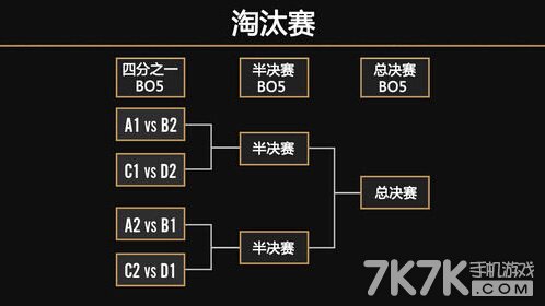 A组第一名 vs B组第二名,C组第一名 vs D组第二名,以上两场比赛的胜者在半决赛中进行对决。