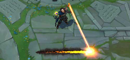 维克托使用机械臂来发射一束狂暴射线,径直穿过目标区域,对路径上的所有敌人造成70/115/160/205/250(+0.7AP)的魔法伤害。