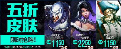 五折皮肤:冰原猎手 沃里克、法国女仆 奈德丽、老兵 普朗克