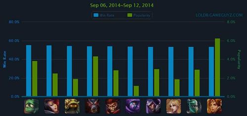 ban率排行榜的数据终于恢复了。本周由亚索登顶ban率排行榜,比第二的豹女高出了13.4%,而前六名的ban率到高达30%以上,而第七名已经跌到约17%,第十的寡妇仅仅只有12.5%.