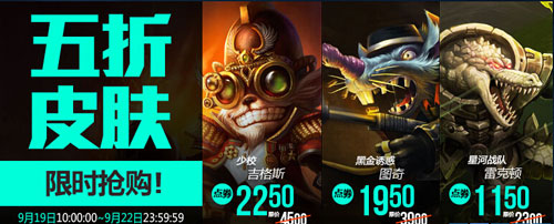 五折皮肤:少校 吉格斯、黑金诱惑 图奇、星河战队 雷克顿