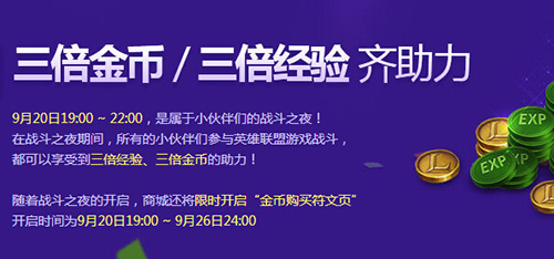 7k小编为您带来lol官网最新活动啦:9月20日19:00 ~ 22:00,是属于小伙伴们的战斗之夜!在战斗之夜期间,所有的小伙伴们参与英雄联盟游戏战斗,都可以享受到三倍经验、三倍金币的助力!随着战斗之夜的开启,商城还将限时开启“金币购买符文页”开启时间为9月20日19:00 ~ 9月26日24:00,不要错过哦,超值金币购买符文页等你来拿,下伙伴们,迎接晚上三倍金币经验皮肤的洗涤吧。