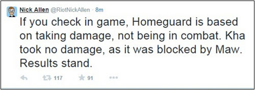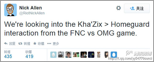微博原文:riot运营总管nick allen声明:我们将对omg vs fnc比赛中的卡兹克与家园卫士的关系进行研究。。。应该不会重赛,但是要给欧美观众一些交代。。。起因:药导回家瞬间被大嘴大招点出饮魔刀被动,虽然回去了,但是当时是属于被攻击状态,按理说是没法触发家园卫士的,但是由于bug家园卫士顺利触发。