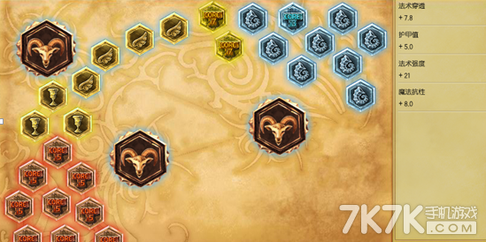 这一套是比较偏向团战坦克的符文,红色法穿,精华移动速度,黄色高级成长生命,蓝色固定法力值,这套天赋打线上也很强,因为你蓝多血多,消耗力强,但是想要单杀同等水平的敌人会有些困难。