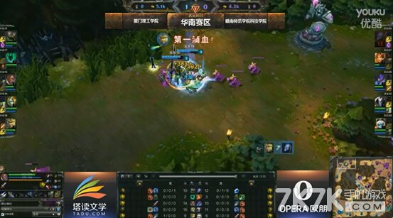 随后厦门理工学院的打野皇子配合上路大树击杀了对方瑞兹取得一血为大树打开了局面,阵亡过的瑞兹已经无法在前期很好的压制大树的发育,上路的局面打开。