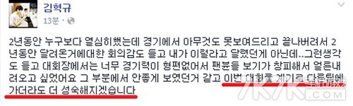 译文:这两年以来我比任何人都更努力去打比赛,但这场比赛我的表现很糟糕,不禁让我怀疑自己的能力,也没有脸面见粉丝很想从比赛舞台下场。这次比赛是教训,希望以后去其他队能更加成熟。