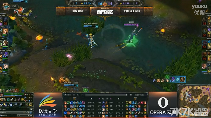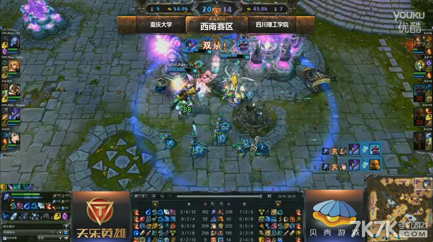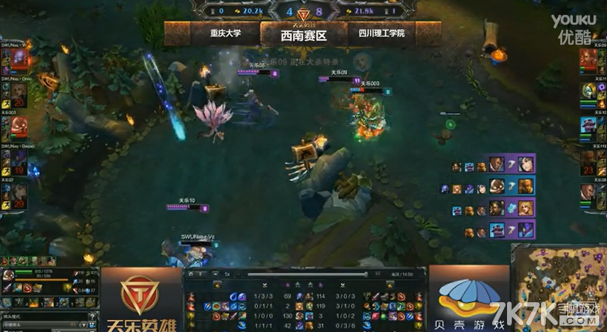 在S4的半决赛皇族 VS OMG BO5激情碰撞的同时,我们的西南赛区线上赛也在激烈进行着。西南传统强队重庆大学对阵四川理工学院MAX战队,越塔强杀拿1血,小龙团战激情碰撞,使得整场比赛看点十足,双方从经济到比分一直是焦灼状态,最后重庆大学通过精彩的两拨小龙团战彻底奠定了优势取得了最后的胜利。但是由于重庆大学队员个人问题无法参