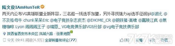 在前几天结束的LPL资格赛中,VG顺利突围成功杀入了下赛季的LPL正赛,对于这支新军来说,LPL的竞争压力会比LSPL要大得多,今天VG的经理也在官方微博发布了一条新动态,表示VG即将迎来新阵容的重组,“3名超一线选手”也是吸引了所有人的眼球,联想到目前在国内的大批韩国顶级选手,会是他们其中的3位吗?