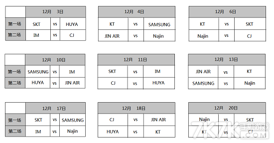 OGN公布的对阵表中可以看到以12月3日SKT对阵虎牙,CJ对阵IM的两场比赛为开端,一共进行3周的比赛。比赛播出时间为每周三,周四和周六晚18点30分(中国时间为17时30分)。