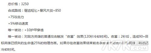 幽梦无疑是新版战争的核心装备,高额攻击力+护穿让其伤害爆炸,三速鞋增加其支援能力,九头蛇能够在Q+WA等后重置普攻,多打一记伤害对一套流英雄非常重要,黑切血手再增强输出的同时也提高其生存能力。Draktharr的暮刃无疑是中后期所有AD战士的首选。