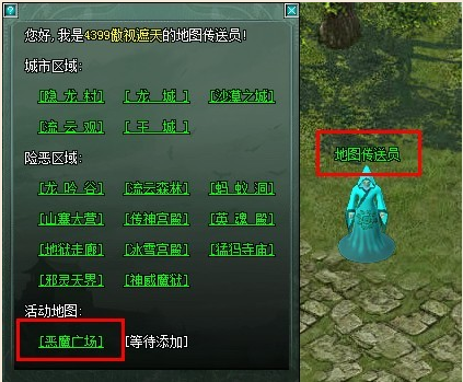 在每个城市的“地图传送员”NPC,点开后,即可在地图面板找到“恶魔广场”,轻松传送即可到达充满血腥味的恶魔广场。