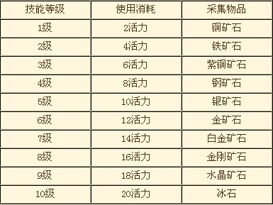 挖矿:能挖掘野外各种各样的原矿,每使用一次技能随机获得1到3个原矿。