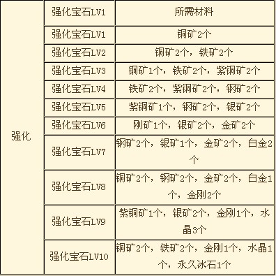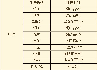 炼药所需要材料精炼:能把各种原矿石精炼为矿石、并能利用一些稀有矿石用来炼化各种镶嵌石,每次制作生成1个物品