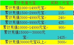 1、活动标准是以活动期间累计充值元宝数额为标准。(如玩家A第一天和第五天分别充值400元宝和600元宝,则可获得1000—1499元宝奖励)
