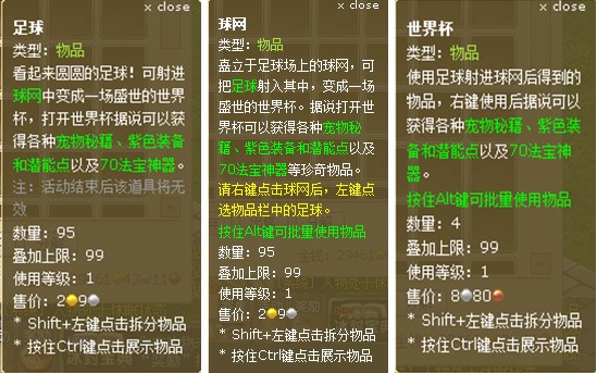 世界杯期间,玩家在外涉猎火族怪物的同时,有一定几率可以获得火族收刮的世界杯专用“足球”,将“足球”射进商城购买的“球网”中可获得一场精彩的“世界杯”,据说打开“世界杯”可以获得各种“高级宠物秘籍”、“高级技能抽取卡”、提升潜能道具、各种高级蓝紫色装备、世界杯竞猜猜币、还可有机会获得70级法宝神器噢。