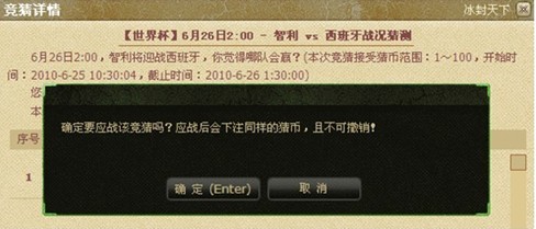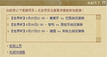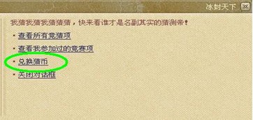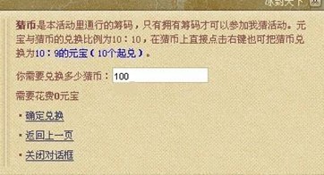 猜币是《冰封天下》为广大玩家准备的参与“世界杯我猜我猜我猜猜猜”活动的专属道具,可与元宝进行互换,兑换方法为: