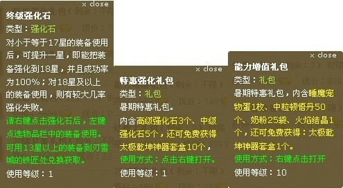 活动礼包2:特惠强化礼包:高级强化石x3、中级强化石x5。额外赠送:太极乾坤套盒x10。