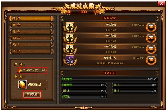 2、完成5个成就任务后,点击成就界面左下的“领取奖励”按钮便可获得一个四级强化石;