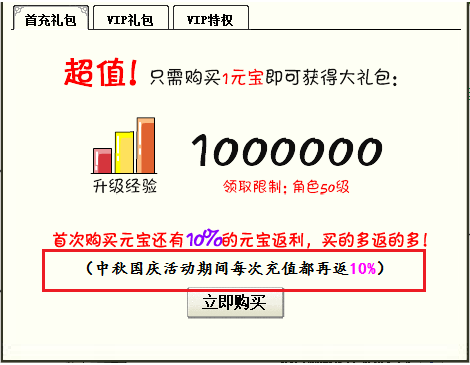 中秋国庆活动一:活动期间,每次充值都返利10%。