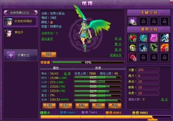 伙伴现在开放到第三次进化,分别达到1/39/69级和出生/大斗师/斗王境界就能进化,伙伴的升级有训练和元宝升级,想要快速有强大伙伴用元宝升级没冷却时间,用银两或者刷副本带伙伴经验还是很高的,如果有不要的伙伴可以退役获得伙伴经验用于新伙伴升级。