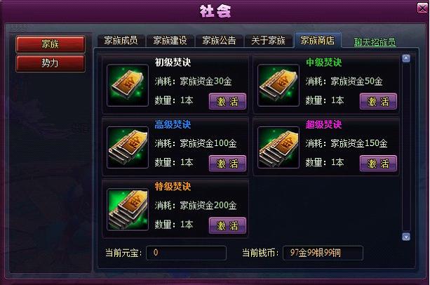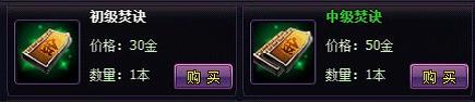 斗技书—【焚诀】书的获得方式:点击【快速购买】或者使用快捷键“O”,打开【社会】中的【家族商店】,可以看到初级、中级、高级、超级、特级的焚诀。