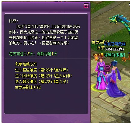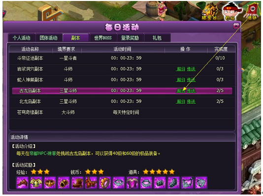 1. 点击画面右上角『活动』→『副本』→古龙岛副本,点击“前往”即可自动寻路前往古龙岛副本NPC 琳菲处。