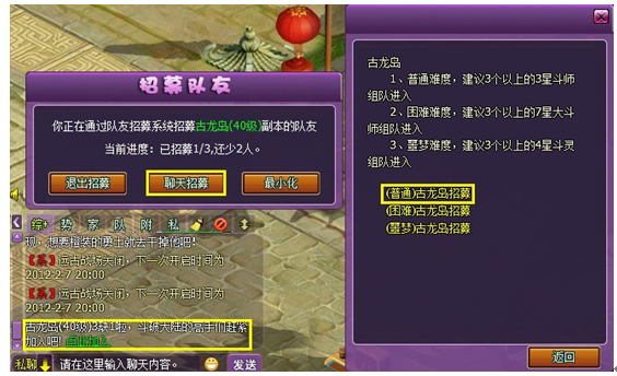 首先选择挑战的难度,再点击聊天招募,系统会在聊天框中发布招募信息,其他玩家可以点击“点此加入”来加入你的队伍