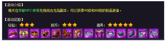 副本掉落各级极品装备,副本难度等级越高奖励越丰厚。副本内敌人十分凶猛,建议3人以上组队进入。