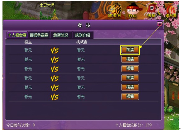 【摆擂】,摆下擂台给其他玩家挑战。摆擂的一方则成为擂主。