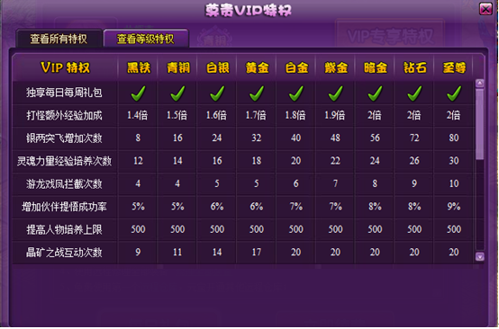 黑铁、青铜、白银、黄金、白金、紫金、暗金、钻石、至尊各自拥有属于的特权,VIP等级越高,特权越多,如下图中,打勾的是对应VIP等级所享有的特权。(具体特权内容以游戏的为准)。