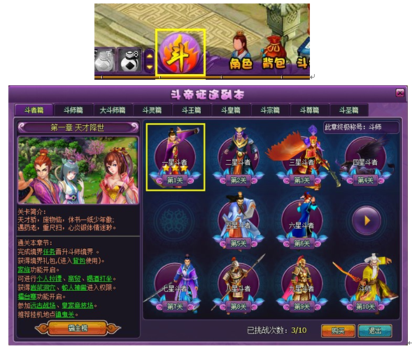 点击游戏下方中间的“斗”字即可打开副本界面;