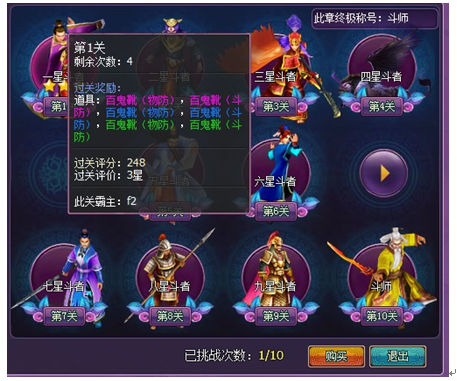 1. 挑战成功每个关卡都可以获得斗帝秘宝,秘宝中藏着丰富的宝物。鼠标移到每个关卡图标上,就会显示该关卡的信息,包括次数,奖励,关卡霸主等。