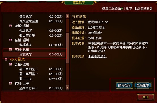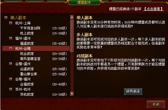 如果是镖盟的官员,就可以直接激活权限内的副本,如果不是官员,还可以选择银两激活的方式