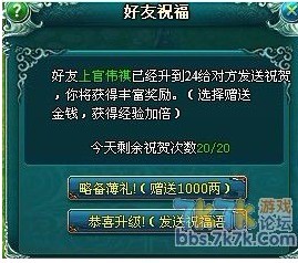 3.好友升级时,会收到好友升级提示,点开祝福窗口即可通过向好友发送祝福,则玩家与被祝福的好友都将获得经验奖励。