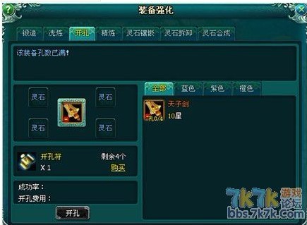发现还是原来本身属性好,有点后悔洗了~?~然后就去开孔,发现装备开孔的概率很高,不用几张就开完四个孔。