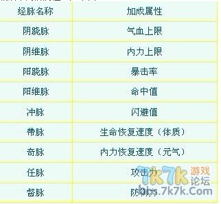 在游戏中,提升相应的经脉,可以提升不同的实力,只要等级达到相应的要求,就可以用YY点穴手,进行经脉修炼,当然,在点穴修炼的同时,可不要乱点哦,不然走火入魔就麻烦了。修炼相应的经脉可以加成不同的属性,如下图: