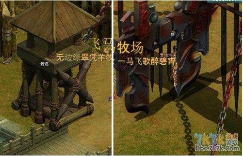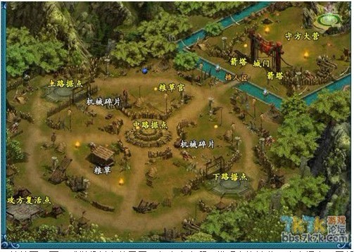 原来地图有所变化,较先前多了一个守方地图,有城门,有护城河,还有唯一的一条小桥,桥边有两座箭塔,往桥中间一站有一夫当官万夫莫开的气势, (其中守方在右上,功方在左下,中间有三个重要据点。我方除守城外,还要采集粮草,功方同样要采积粮草占据据点来供队伍的补积,这都是一样。不同的是攻方多了一个碎片采集,采集后可制造出恐怖的投石车:守方多了城门和箭塔还有关系生死存亡的龙脉之剑啦 )