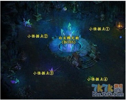 据点①刷新怪物30秒后,据点②刷新怪物,30秒后,据点③刷新怪物,再30秒后据点④刷新怪物,再30秒后,据点①再次刷新怪物,如此类推,当据点④刷新第三次怪物后60秒,地图中央刷新终极BOSS--白头鸦天狗。消灭BOSS后,可获得大量道具。