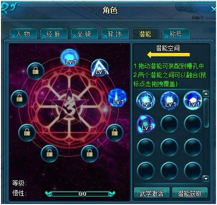在潜能空间里,你可以看到自己获取的潜能。将它们拖动到刚刚开启的潜能槽里就能够使用这些潜能了,你的战斗力,又将再上一个台阶。