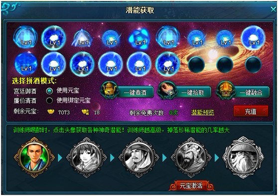 这5个人各个身怀绝技并且嗜酒如命,要想从他们手中得到你想要的绝世潜能,就要和他们拼酒。使用元宝和绑定元宝能用不一样的酒与之对饮。点击第一名训练师,就有可能引来下面更高级的训练师与你对饮。当他们头像被点亮时,你就可以与他们拼酒啦!越高级的训练师能教会你的潜能会越厉害。如果你有幸拜访到了我们第五位训练师李淳风,橙色潜能就向你招手啦。