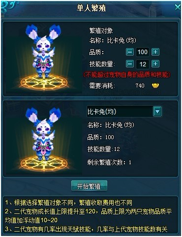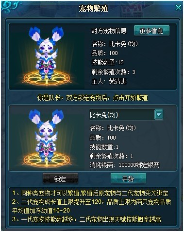 2、双方各选择一只拥有繁殖次数的宠物,两只宠物的攻防血均类型一样,且不在历练与战斗状态,双方锁定后,队长点击开始则繁殖开始,繁殖次数-1