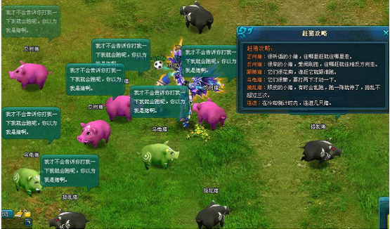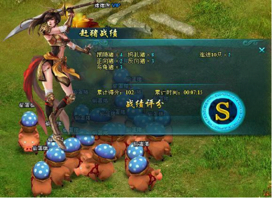 在副本时间内,玩家把副本内的猪赶进指定区域(猪圈),根据猪的种类、数量、连进次数进行得分统计。不同的得分段,刷出不同数量、不同成长的宠物。