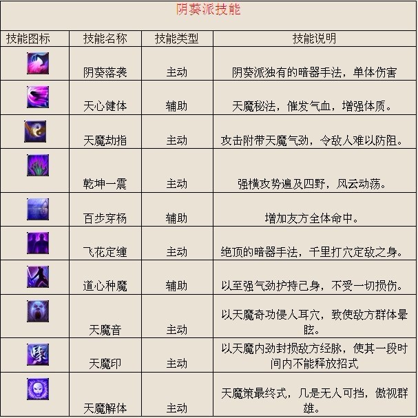 阴葵派擅长使用飞镖,镖无虚发,拥有技能如下:
