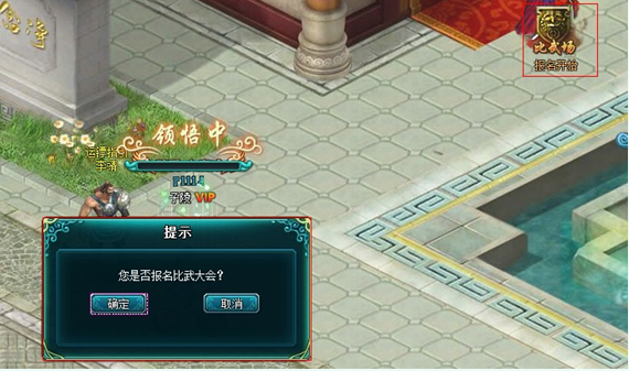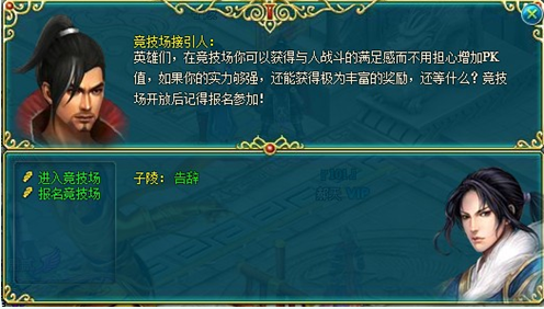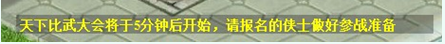 竞技场每日开战前5分钟,会有全服滚屏提示“天下比武大会将于5分钟后开始,请报名的侠士做好参战准备”。