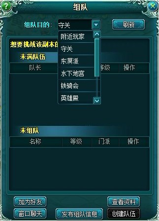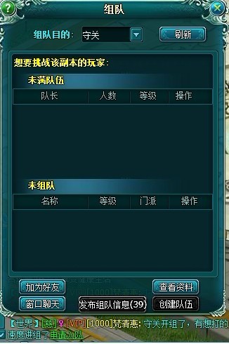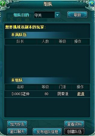 玩家B也选择守关,点击刷新,便能看到所有想守关的队伍和未组队的玩家,可以查看这些玩家资料,加为好友,窗口聊天,最方便的是可以申请加入队伍。