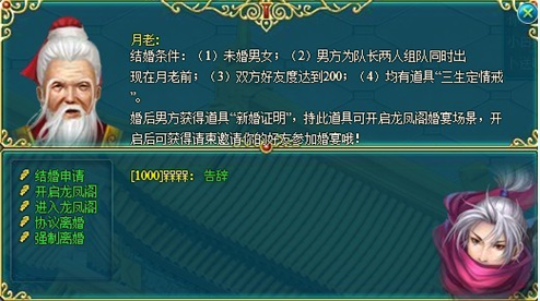 夫妻双方组队前往 “月老”处,丈夫单方面花费20000银两可以解除双方关系;